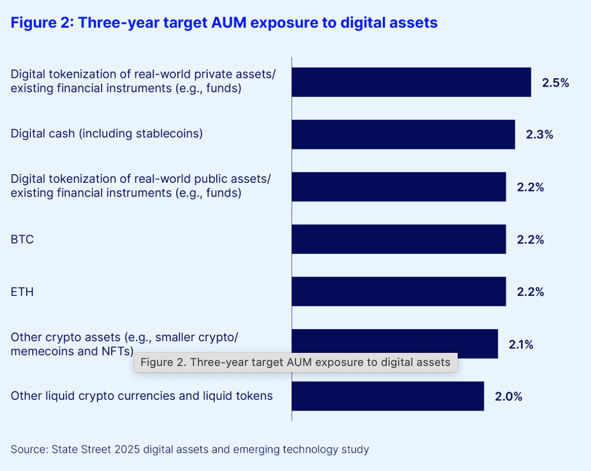 Most holdings are concentrated in digital cash (stablecoins) and tokenized versions of listed equities or fixed income, with respondents allocating about 1% of their portfolios to each and asset managers maintaining greater exposure.