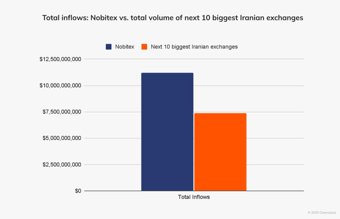 Chainalysis said it tracked Nobitex’s total inflows and found it has well over $11 billion, compared to just under $7.5 billion for the next ten largest Iranian exchanges combined.