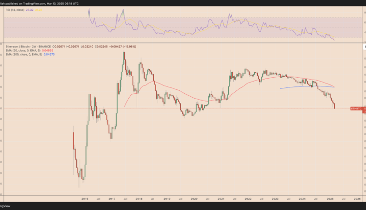 On March 13, ETH/BTC—a pair that tracks Ether’s strength against Bitcoin—dropped by over 1.50% to reach $0.022, its lowest level since May 2020.