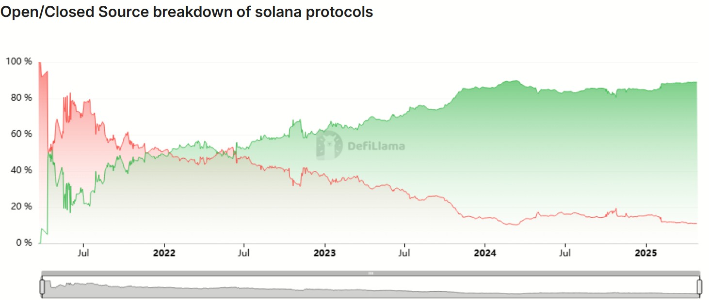 According to DefiLlama data, closed-source protocols dominated Solana’s DeFi ecosystem in its early days but shared half of the stage with open-source alternatives in late 2021. Since then, the shift has been gradual but clear. As of April 29, open-source protocols accounted for nearly 90% of the value locked in Solana’s DeFi space.