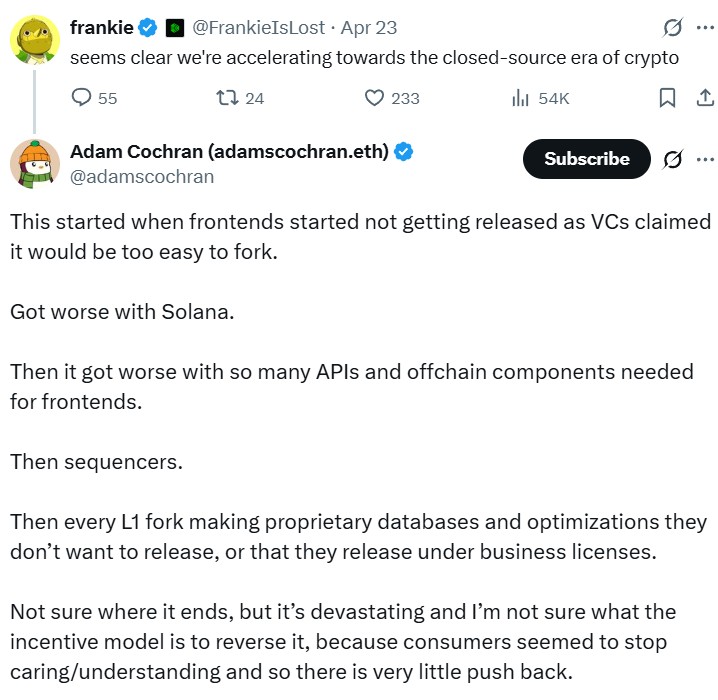 Closed-source systems run counter to crypto’s original vision of decentralization and transparency. What started as a grassroots movement among cypherpunks and hackers is now increasingly mainstream and integrating with the very institutional system it once sought to disrupt.