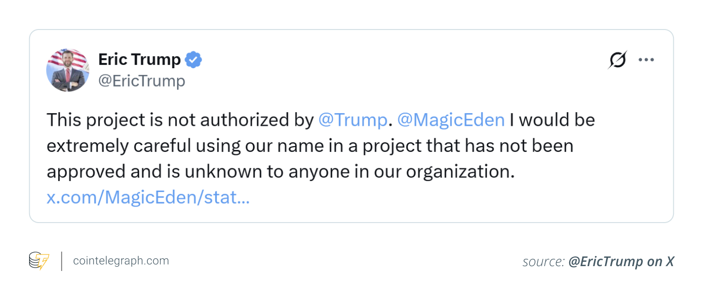 Despite the clear affirmation from Magic Eden’s leadership, the Trump family’s immediate and coordinated disavowals cast doubt on the legitimacy of the branding. The situation raised questions about whether Magic Eden had misunderstood the scope of its previous interactions with the TRUMP token team, possibly assuming that past NFT collaborations granted broader brand rights, or whether it had relied on assurances from Fight Fight Fight without verifying direct authorization from the Trump family or their affiliated crypto entity, World Liberty Financial.