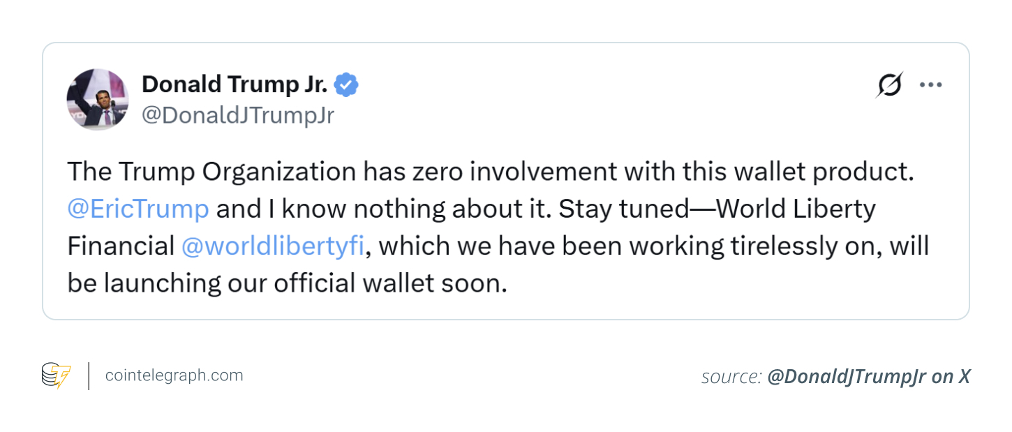 Donald Trump Jr., who serves as World Liberty Financial’s “Web3 ambassador,” publicly confirmed the development of an authenticated Trump-affiliated wallet.