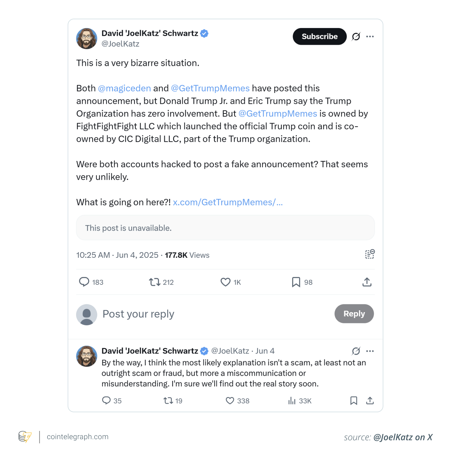 Ripple chief technology officer David Schwartz weighed in on the Trump Wallet controversy via a now-unavailable X post, describing the situation as unusual and highlighting the conflicting positions between Magic Eden, GetTrumpMemes and the Trump family. He observed that GetTrumpMemes is owned by Fight Fight Fight, the entity behind the TRUMP coin, and co-owned by CIC Digital, a company reportedly linked to The Trump Organization. Schwartz suggested that the controversy was more likely the result of a miscommunication or misunderstanding than deliberate fraud.