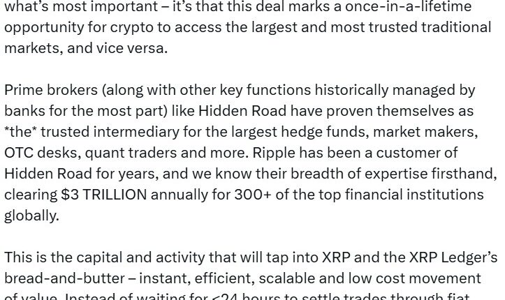 “Where Metaco lays the foundation — the vault for storing assets — Hidden Road allows Ripple to leverage its massive balance sheet to turbocharge Hidden Road’s business, in which access to capital — a lot of capital — is critical in order to keep growing and competing,” Johansen said.