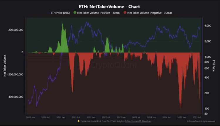As of Tuesday, ETH’s Net Taker Volume dropped to -$418.8 million, the second-largest daily outflow ever, with 115,400 more ETH sold than bought via market orders, according to CryptoQuant data.