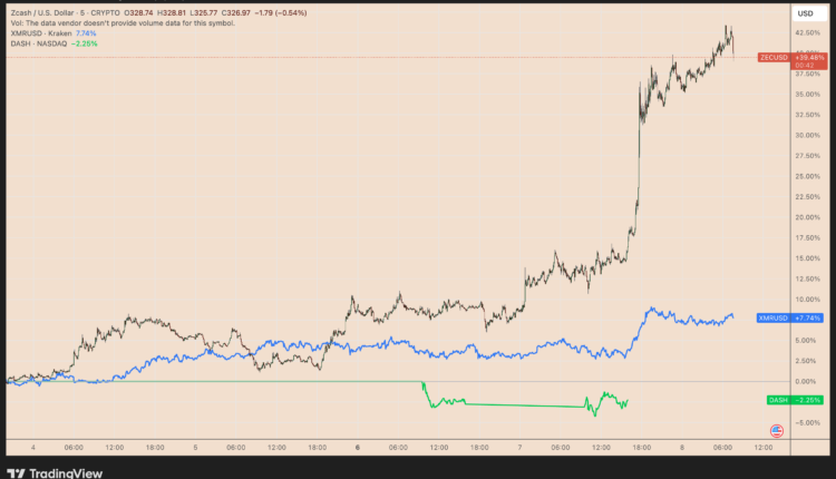 ZEC/USD vs. XMR/USD and DASH/USD price performance in the past five days. Source: TradingView