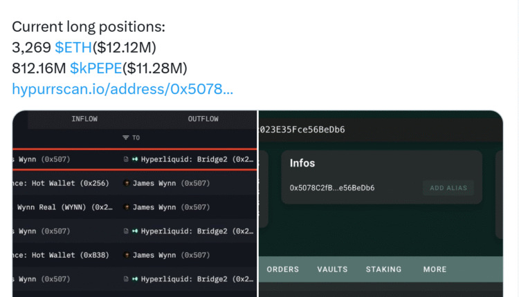 James Wynn, a crypto trader known for his high-leverage crypto bets, has initiated two major leveraged positions, including a 25x long on Ether and a 10x long on PEPE.