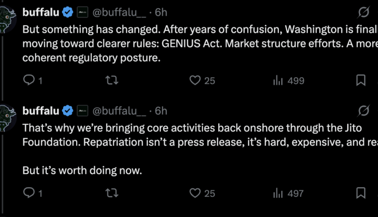 The Jito Foundation, the nonprofit organization facilitating the development of the Jito platform, said it will return to the United States, citing “clearer rules” for digital assets in the country.