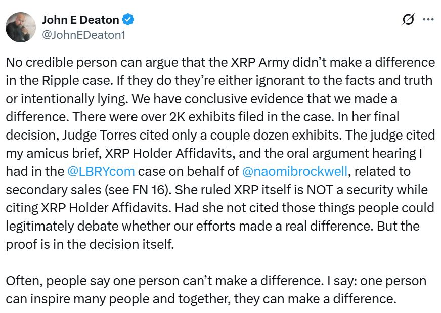 “She ruled XRP itself is NOT a security while citing XRP Holder Affidavits. Had she not cited those things, people could legitimately debate whether our efforts made a real difference,” Deaton said.