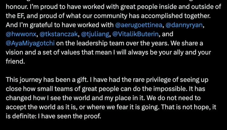 The departure of Stark from the Ethereum Foundation represents the most high-profile exit from the organization since Ethereum co-founder Vitalik Buterin announced sweeping leadership changes and a new direction for the Foundation in 2025. A day earlier, another Foundation contributor, Trent Van Epps, announced that he resigned last week.