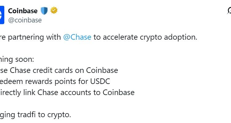 Coinbase announced Wednesday that Chase credit card holders can use their cards to buy crypto on Coinbase starting this fall. In addition, Coinbase said JPMorgan’s customers will also be able to redeem their Chase Ultimate Rewards Points for USDC (USDC) in 2026.