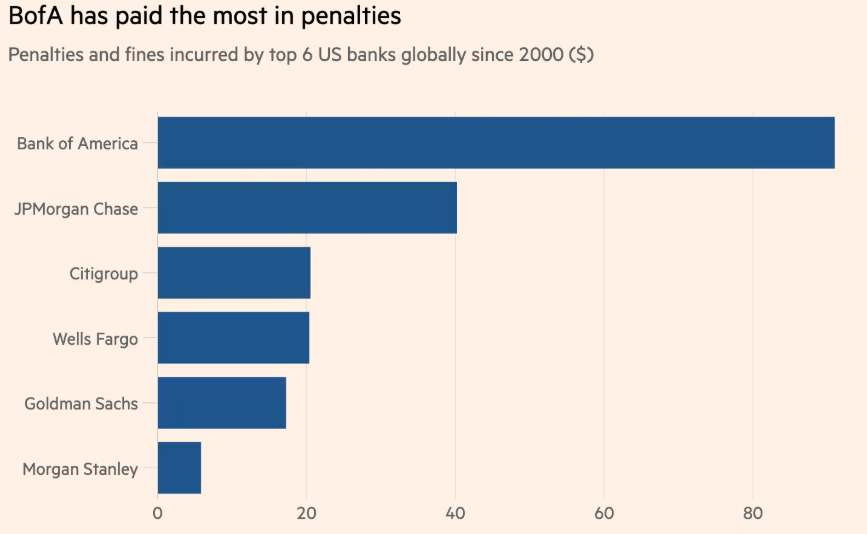 Fines and penalties paid by the six leading US banks over the past 20 years. Source: Better Markets/FT