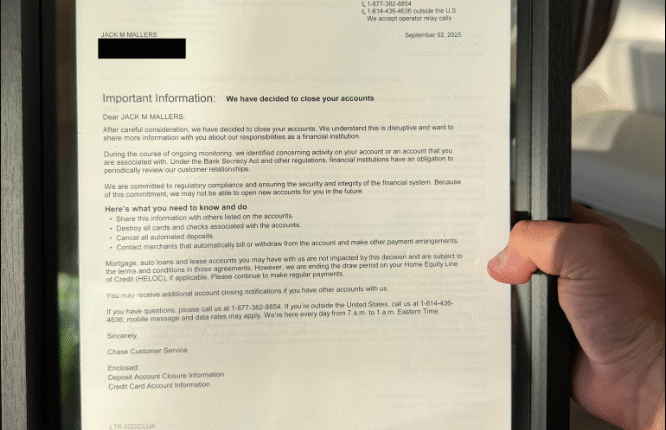“Last month, J.P. Morgan Chase threw me out of the bank,” Mallers wrote. “Every time I asked them why, they said the same thing: We aren’t allowed to tell you.”