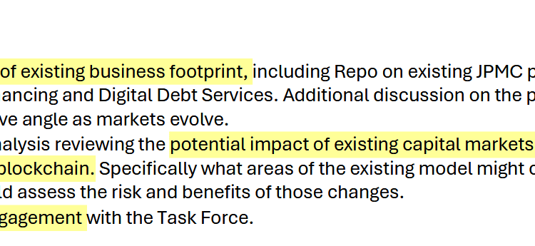 The two groups also discussed JPMorgan’s existing “business footprint” in the crypto space, including its current digital platform that handles repurchase agreements — a type of short-term borrowing in financial markets that falls under its “Digital Financing” and “Digital Debt Services” offerings.