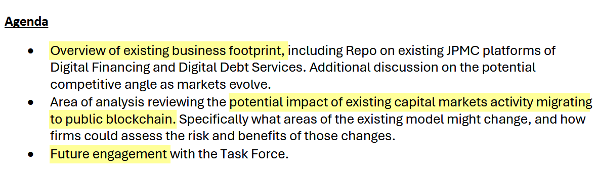 Agenda in the digital asset discussion held between JPMorgan and the SEC Crypto Task Force. Source: SEC