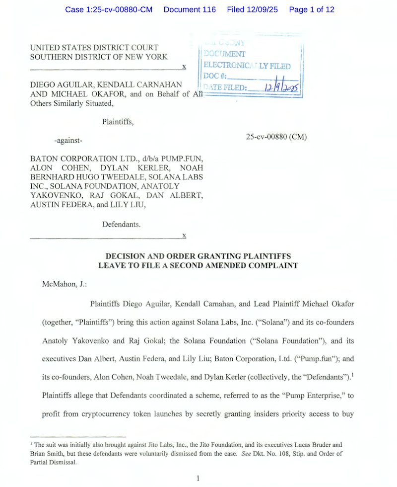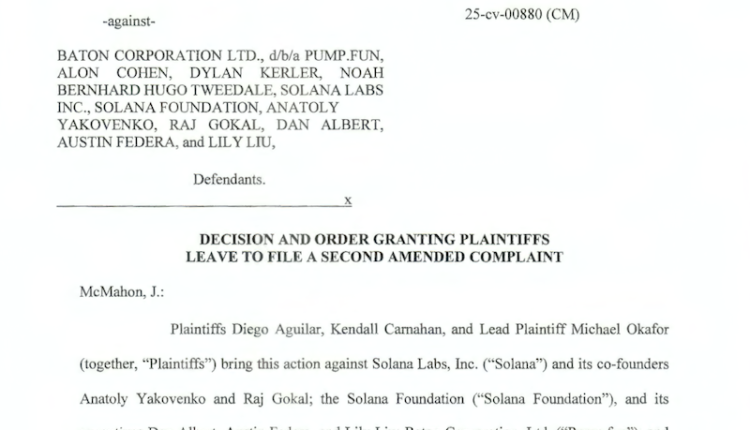 The judge granted a motion to amend and refile to include new evidence a class-action lawsuit against memecoin launch platform Pump.fun, the maximal extractable value (MEV) infrastructure company Jito Labs, the Solana Foundation, which is the nonprofit organization behind the Solana ecosystem, and others.