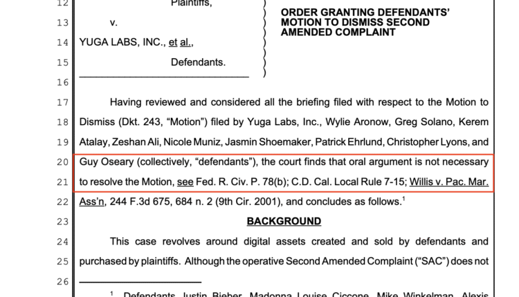 Judge Fernando M. Olguin ruled the plaintiffs did not demonstrate how Bored Ape Yacht Club (BAYC), ApeCoin (APE) or other NFTs sold by Yuga satisfied the three conditions of the Howey test, a standard used by the Securities and Exchange Commission (SEC) to determine whether a transaction qualifies as an investment contract. The lawsuit was originally filed in 2022.