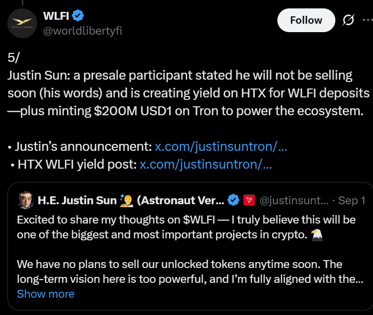 On Thursday, Sun responded to speculation in an X thread, saying in a translated post that his address had only carried out a few routine exchange deposit tests with very small amounts of WLFI tokens before creating address dispersion.