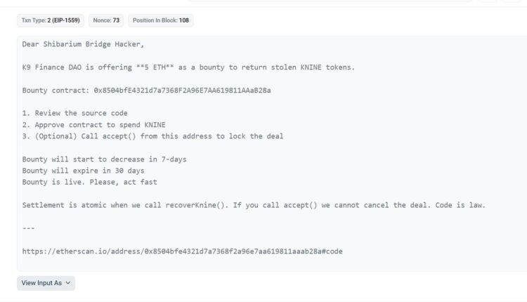 K9 Finance’s message to the Shibarium attacker. Source: Etherscan