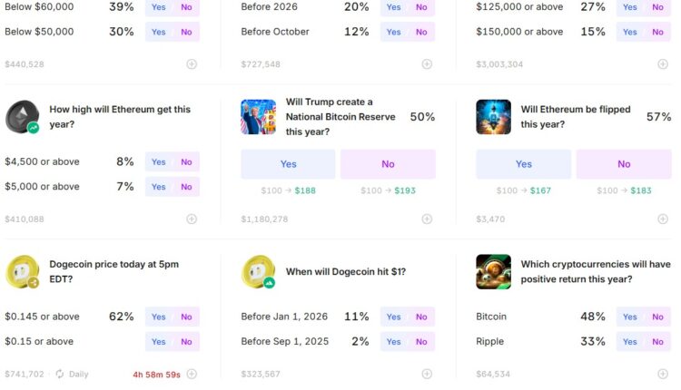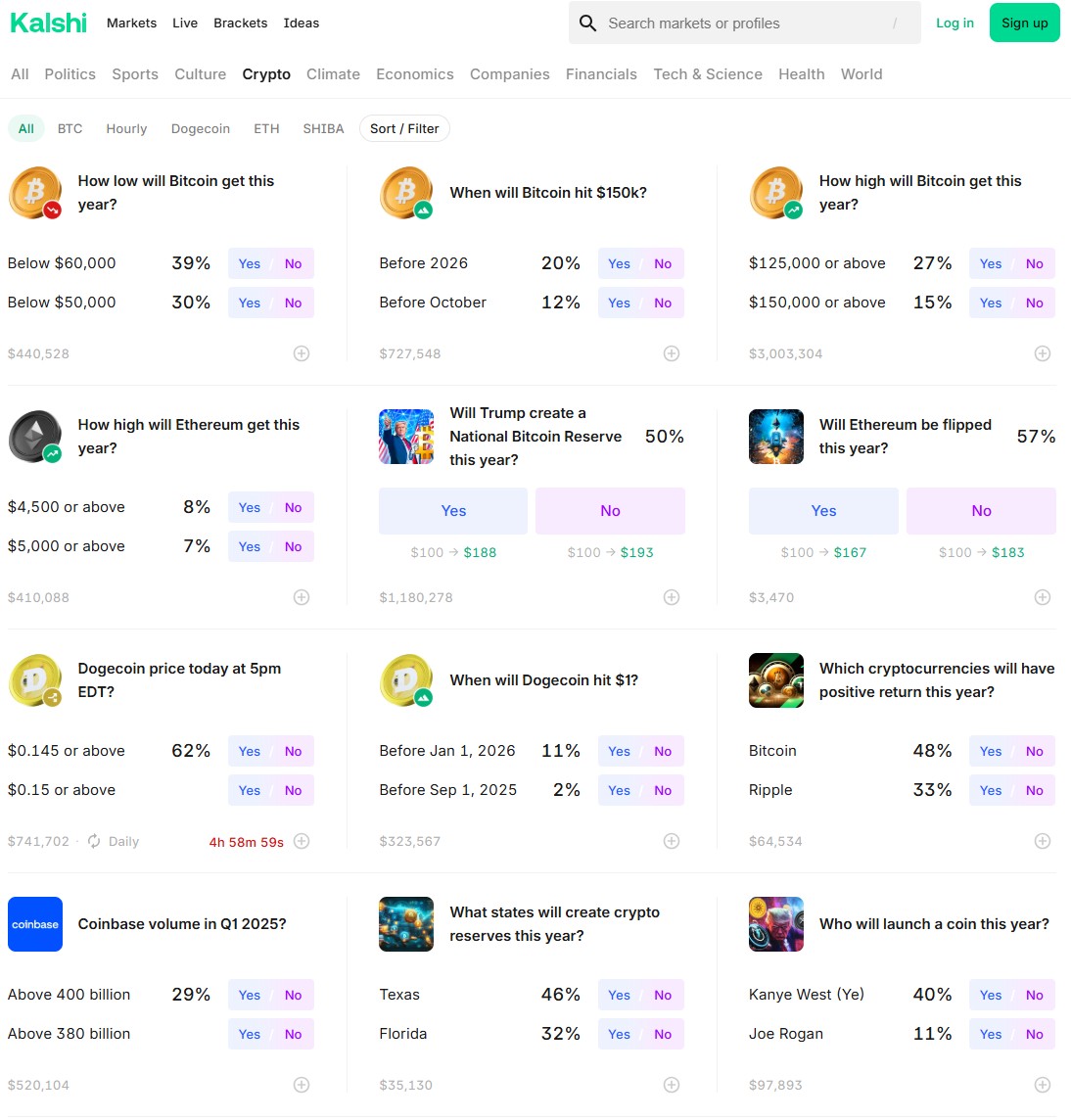 Kalshi is a derivatives exchange regulated by the US Commodity Futures Trading Commission (CFTC). As of April 9, it listed some 50 crypto-related event contracts, including markets for betting on coins’ 2025 highs and lows, as well as on headlines such as US President Donald Trump’s proposed National Bitcoin Reserve.