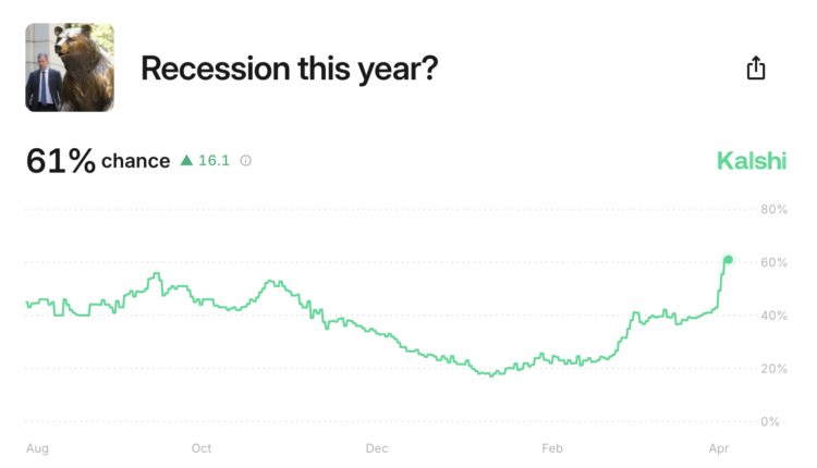 Traders on the Kalshi prediction market place the odds of a US recession in 2025 at 61%, following the sweeping tariff order signed by President Donald Trump on April 2.