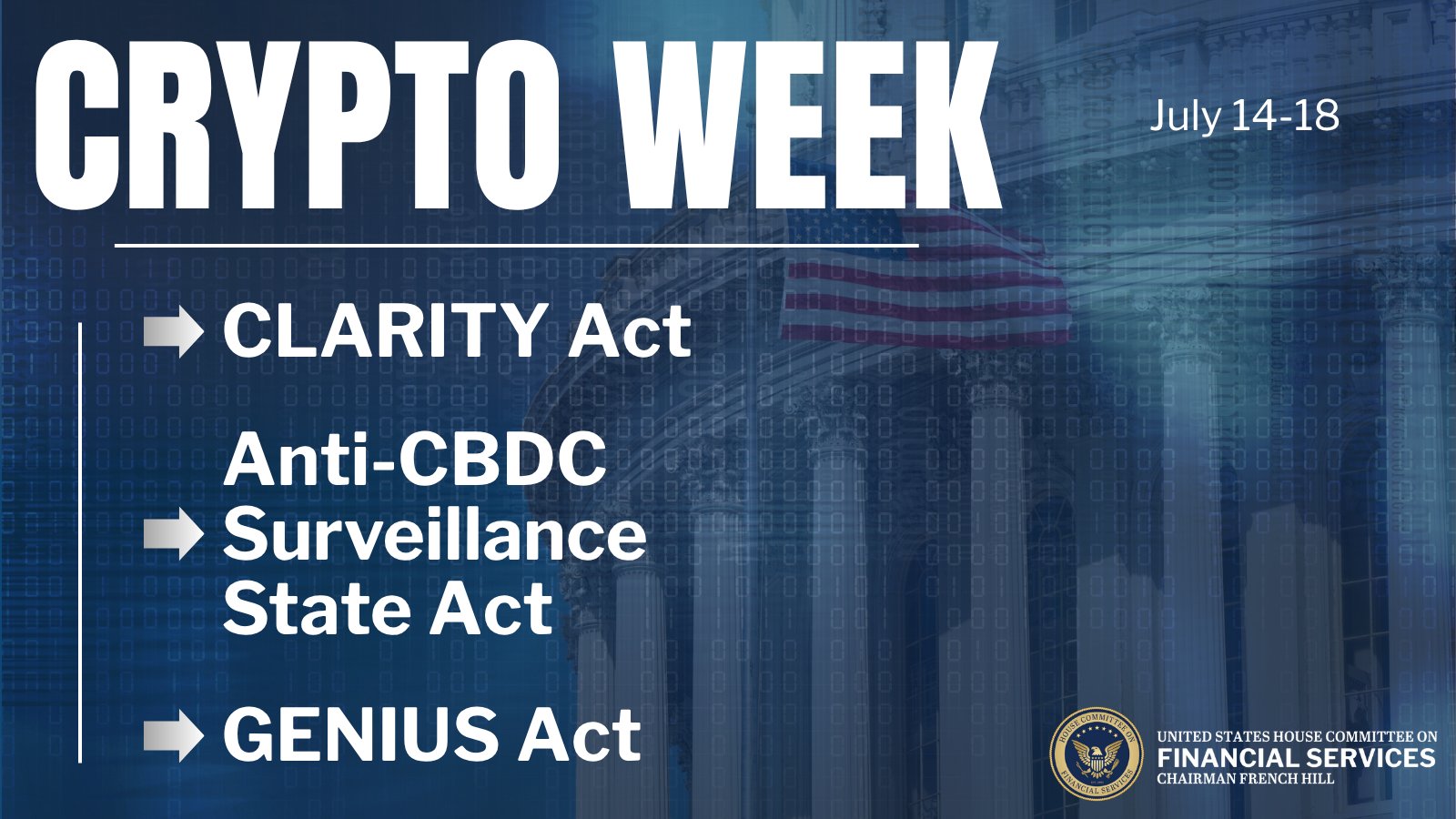 “Crypto Week” was announced by French Hill, chair of the House Committee on Financial Services, on July 3. Hill said the legislation would establish “a clear regulatory framework for digital assets,” as well as set the ground rules for dollar-pegged stablecoin issuance, and aims to block central bank digital currency (CBDC) issuance “to safeguard Americans’ financial privacy.”