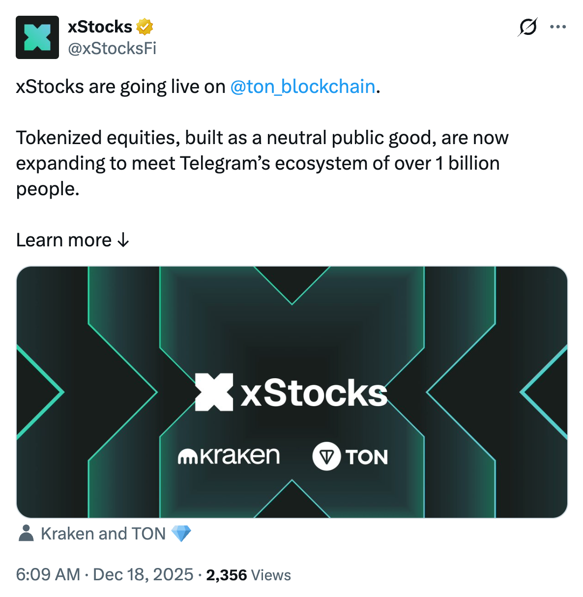“Launching xStocks on TON brings tokenized equities onto truly open infrastructure,” Kraken co-CEO Arjun Sethi said in the announcement, adding that the launch marks the first time for Telegram users to access tokenized US equities onchain.