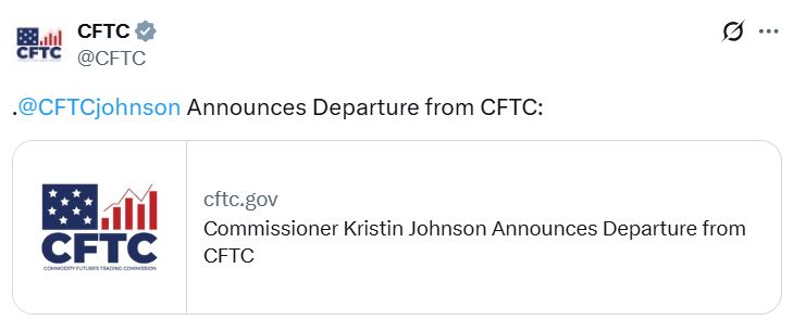 Outgoing US Commodity Futures Trading Commission commissioner Kristin Johnson says she will be leaving the regulator next week, on Wednesday, Sept. 3, after saying earlier this year she’d leave the agency before 2026 after completing her term.