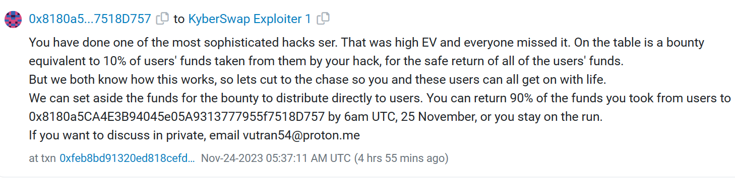 After hiding the stolen funds, the hacker wrote an on-chain message directed to KyberSwap developers, employees, decentralized autonomous organization members and liquidity providers, stating, “Negotiations will start in a few hours when I am fully rested.”