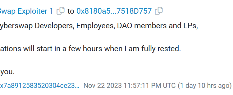 After hiding the stolen funds, the hacker wrote an on-chain message directed to KyberSwap developers, employees, decentralized autonomous organization members and liquidity providers, stating, “Negotiations will start in a few hours when I am fully rested.”
