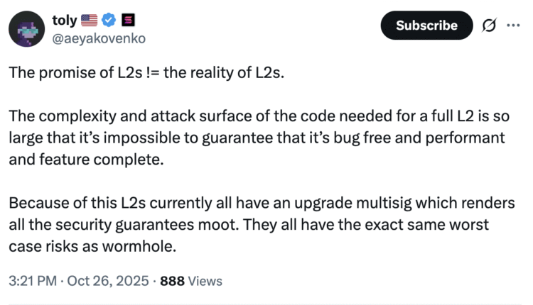 Layer-2 scaling networks feature a huge attack surface and code bases so large that they cannot be properly audited for software bugs. User funds can also be shifted from L2s, which rely on multi-signature custody, without the users’ consent, Yakovenko added.