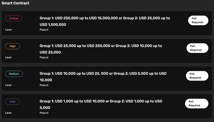 Critical smart contract vulnerabilities reported on Ethereum, BNB Chain, Avalanche, Polygon, Arbitrum, Optimism and Fantom pay the higher of $250,000 or 10% of the assets’ value at risk at the time of reporting. The payout for critical vulnerabilities starts at $25,000 for all other chains. Non-critical rewards are based on internal criteria.
