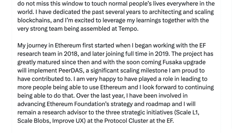 Feist said he will remain as a “research adviser” at the Ethereum Foundation to provide input on scaling the layer-1 network, improving user experience (UX), and blobs, a feature of the Ethereum network that frees up blockspace by temporarily storing data. He added: