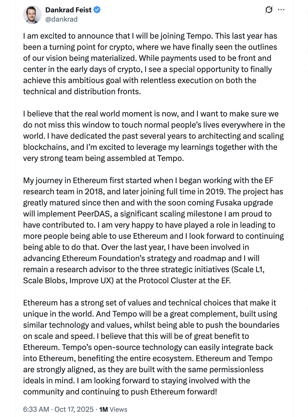 Dankrad Feist, a longtime Ethereum developer and researcher at the Ethereum Foundation, announced Friday that he’s joining Tempo, a layer-1 blockchain for payments and stablecoins built by Stripe and Paradigm.