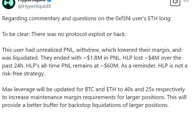 In response to the trade, Hyperliquid lowered its Bitcoin (BTC) leverage to 40x and its ETH leverage allowance to 25x. This increases the maintenance margin requirements for larger positions on the DEX. “This will provide a better buffer for backstop liquidations of larger positions,” Hyperliquid stated.