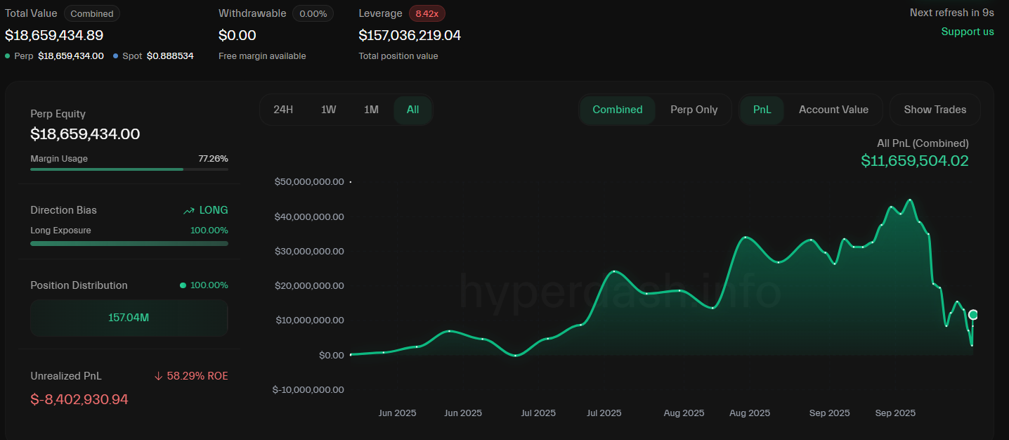 Taiwanese music celebrity and high-profile digital asset investor Jeffrey Huang, also known as “Machi Big Brother,” is facing a nearly $9 million floating loss on his Hyperliquid account.