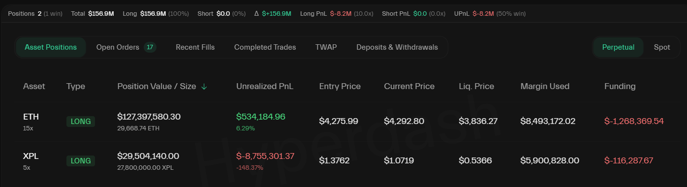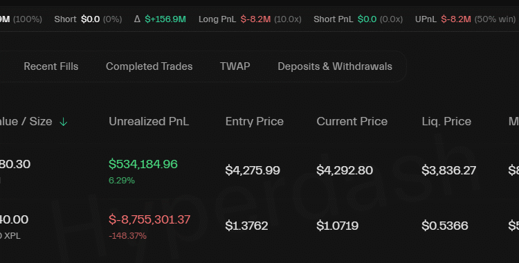 From a profit of approximately $44 million just 13 days ago, the celebrity is now sitting on an unrealized loss of $8.7 million on their 5x leveraged long position, which involves betting on the price appreciation of the Plasma (XPL) token, according to blockchain data from Hyperdash. The position has a liquidation threshold of $0.5366.
