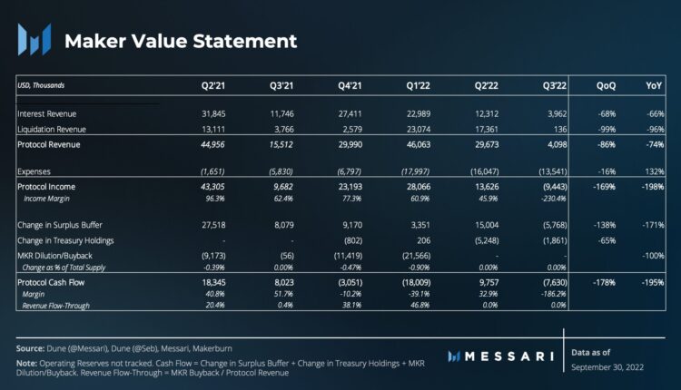 MakerDAO, the governing body of the Maker Protocol has seen its revenue plummet in the third quarter of 2022, caused by a fall in loan demand and few liquidations, while expenses have remained high.