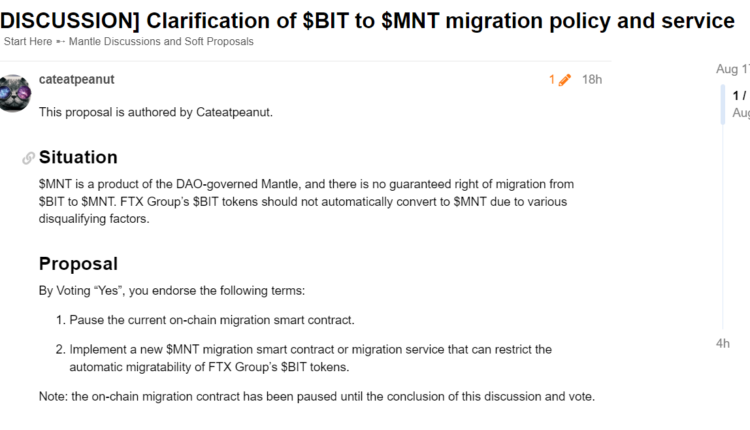 On Aug 17, the matter of the BIT tokens held by Alameda became a subject of discussion for Mantle community members. Cateatpeanut argued that FTX Group’s BIT should not be automatically converted to MNT because of “various disqualifying factors.” According to the community member, there is no “guaranteed right of migration” for the tokens, and he then initiated the proposal.