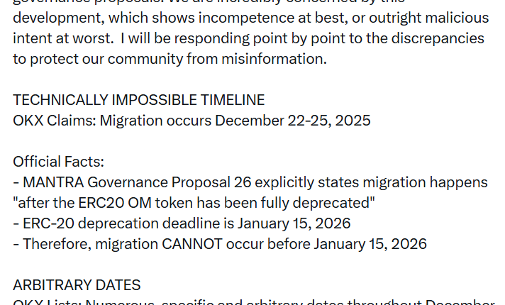 Mullin also said OKX’s post referenced “arbitrary dates throughout December 2025,” while Mantra has not yet announced an official implementation date.