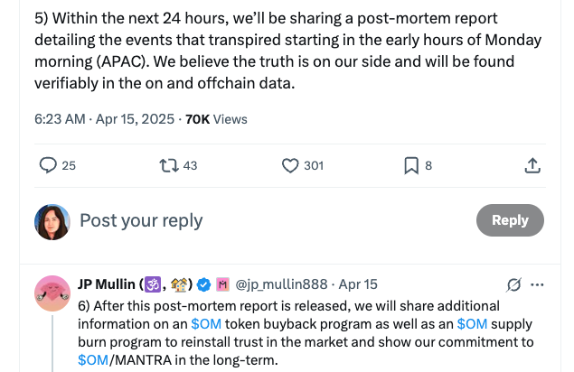 Although Mantra CEO John Mullin previously said that the team was preparing a post-mortem, the new statement offered few new details about the reasons behind the rapid movement of OM tokens to exchanges and the subsequent liquidation cascade.