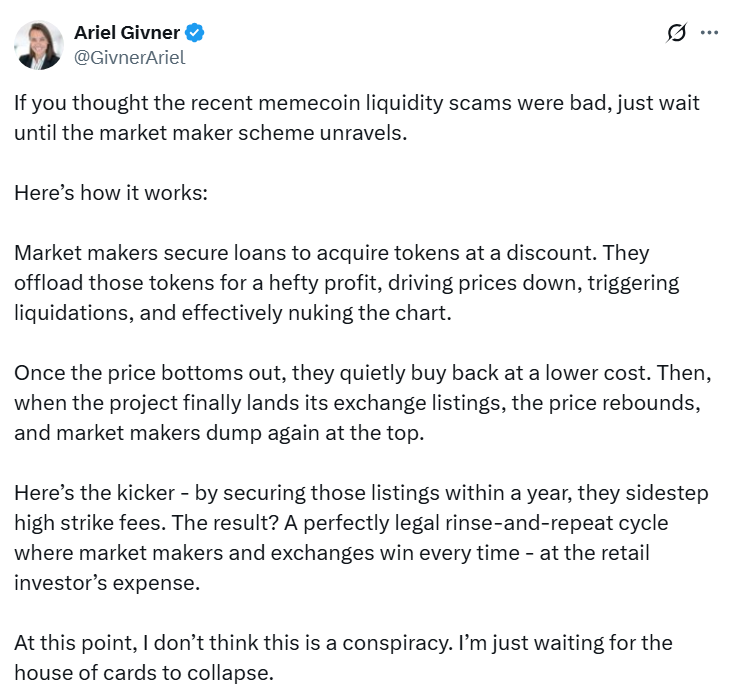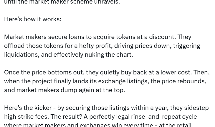 But the episode highlights a growing trend: The loan option model has become a convenient scapegoat for token collapses — often with good reason. In a space where deal terms are hidden behind NDAs and roles like “market maker” or “trading partner” are fluid at best, it’s no surprise the public assumes the worst.