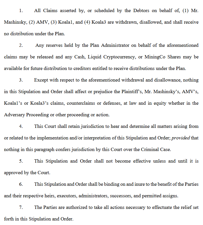 The agreement stipulates that Celsius debtors can distribute funds tied up due to claims made by Mashinsky and the three related entities.