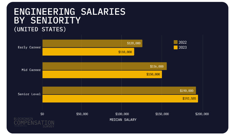 In the U.S., junior and intermediate-level Web3 developer salaries fell by 4-8% within the past year to between $110,000-$150,000. Meanwhile, compensation for senior-level developers grew by 1.5% to $192,585 during the same period.