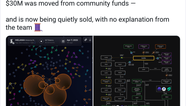 Bubblemaps said in an April 7 X post that 50 million MELANIA tokens worth around $30 million “was moved from community funds — and is now being quietly sold, with no explanation from the team.”