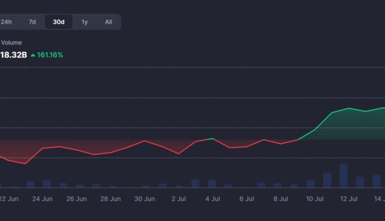 CoinMarketCap data showed that July has seen bigger trading volumes for memecoins than the previous month, with the sector’s 24-hour trading volume peaking at over $18 billion on Thursday. Its second-highest trading volume in the last 30 days was $17.09 billion on Saturday.
