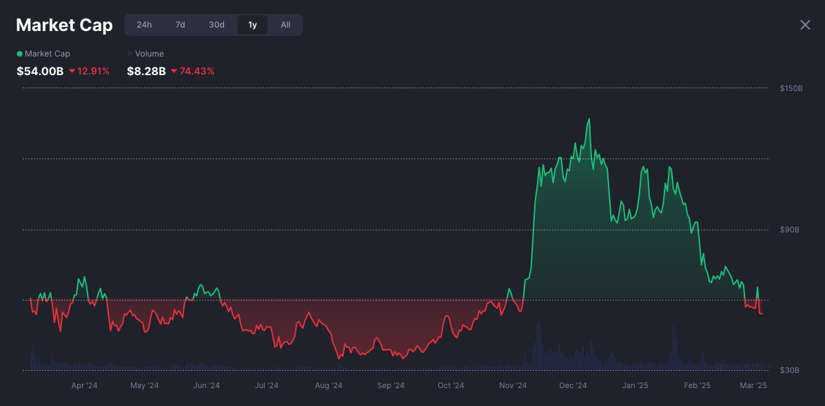 According to CoinMarketCap data, the total market capitalization of memecoins stood at $54 billion on March 5, down 56% from $124 billion on Dec. 5, 2024.