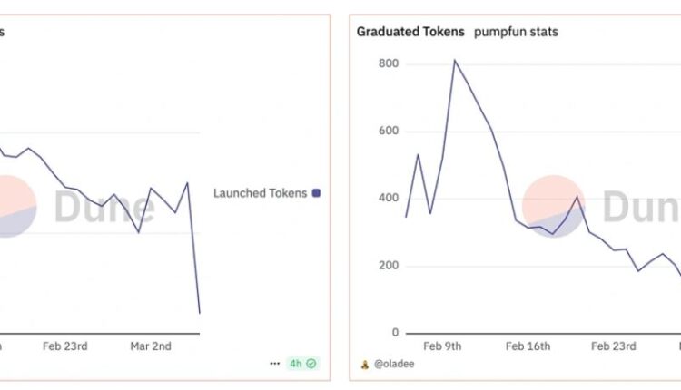 Metrics for token launchpad Pump.fun immediately plummeted following the Libra (LIBRA) rug, Ong said in a March 6 report, with newly created tokens and daily graduated tokens on the platform falling over 90% since their February peak.