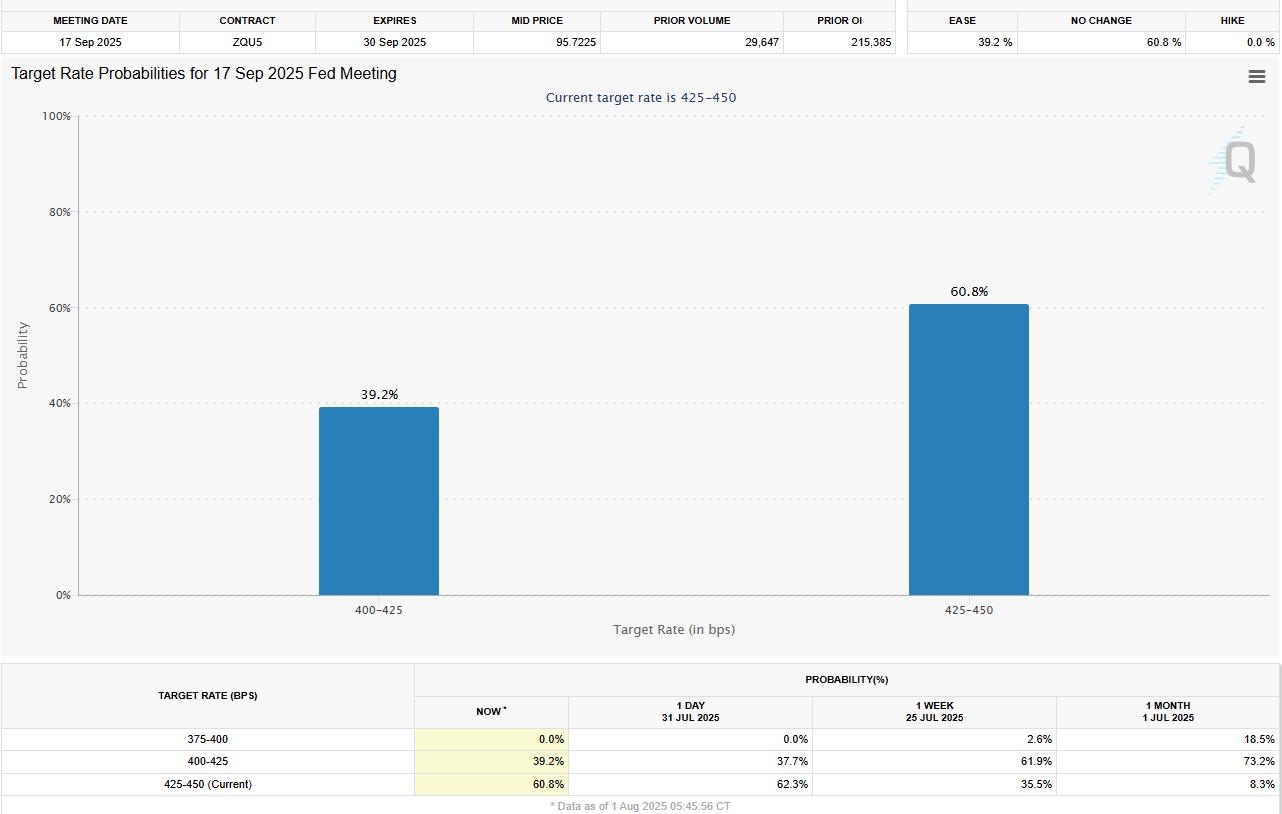 Meanwhile, markets are currently pricing in a 60.8% chance that the Fed will keep interest rates steady during the next Federal Open Market Committee meeting on Sept. 17, according to the latest estimates of the CME Group’s FedWatch tool.